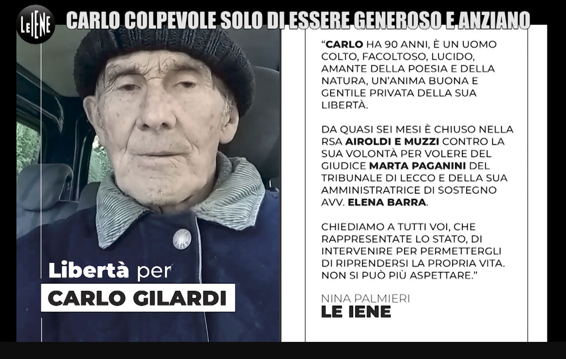 La Iene" tornano a parlare del caso di Carlo Gilardi. La nota trasmissione di approfondimento che va in onda su Italia 1 ha trasmesso un corposo serivizio realizzato da Giovanna "Nina" Palmieri, che fa il punto della situazione che riguarda il 90enne professore, da tempo in pensione, che dalla sua Airuno è stato trasferito, un anno fa, all'interno della Rsa "Airoldi&Muzzi" di Germanedo, rione della città capoluogo.