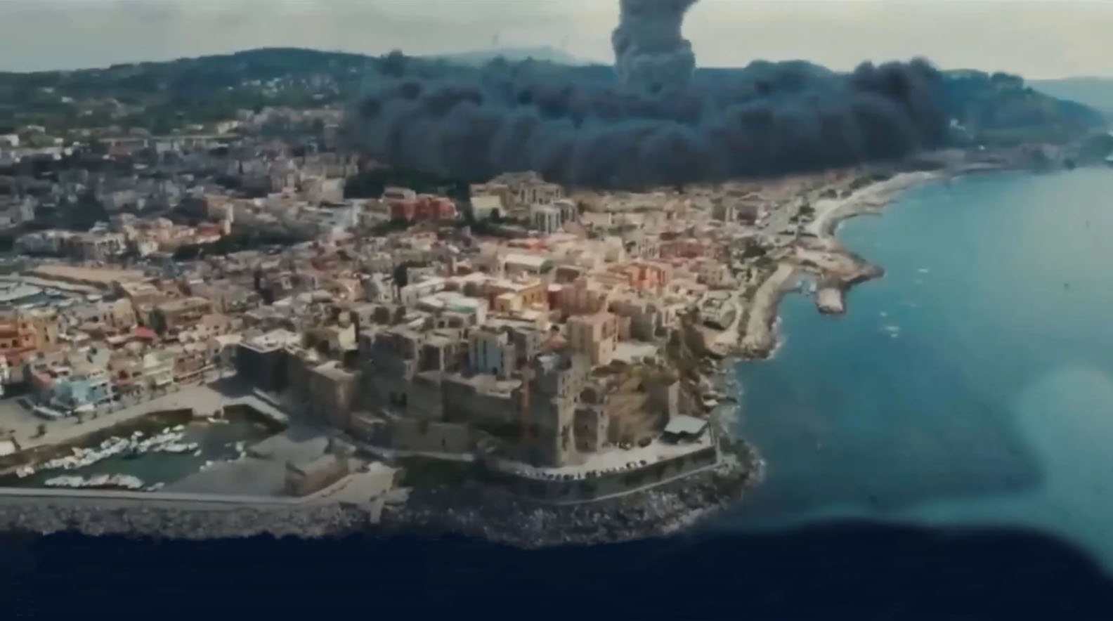 E Amy Donovan, professoressa di Geografia all’Università di Cambridge, aggiunge: «A quel punto la città dovrebbe essere deserta perché l’aria sarebbe satura di cenere, materiale piroclastico e residui vulcanici di ogni tipo». E ancora, la voce della giornalista fuori campo commenta: «Napoli scompare sotto trenta metri di materiale vulcanico». Poi, quasi a voler giustificare un simile, devastante scenario: «L’immagine è sconcertante ma scientificamente possibile». Segue il frame di animazione che mostra la città ormai coperta da una coltre di cenere grigio-rossastra con la sola eccezione della collina di San Martino.
